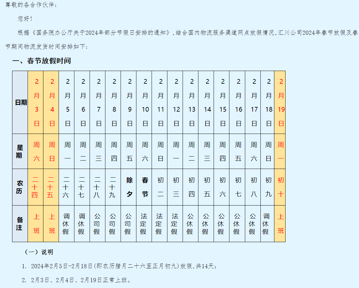 匯川變頻器-關于2024年春節放假及物流 發貨時間安排的函
