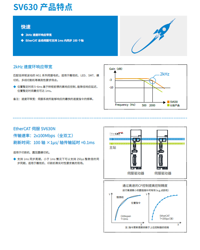 SV630 系列伺服是匯川技術研制的高性能中小功率的交流伺服產品。該系列產品功率范圍為0.05kW ~ 7.5 kW,采用以太網通訊接口,支持EtherCAT 、Modbus、CANopen 和CANLink 等通信協議,采用對應的通信接口,配合上位機可實現多臺伺服驅動器聯網運行。